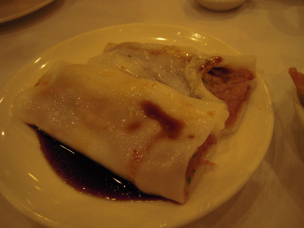 I ate this... it was caled rice noodle rolls with beef, "cheong fun"" I had a few of them.... beef on the inside... I am not what you call a great "chop-stick user" so it was hard to eat.... but I liked it.... it looked like squid with beef on the inside!"